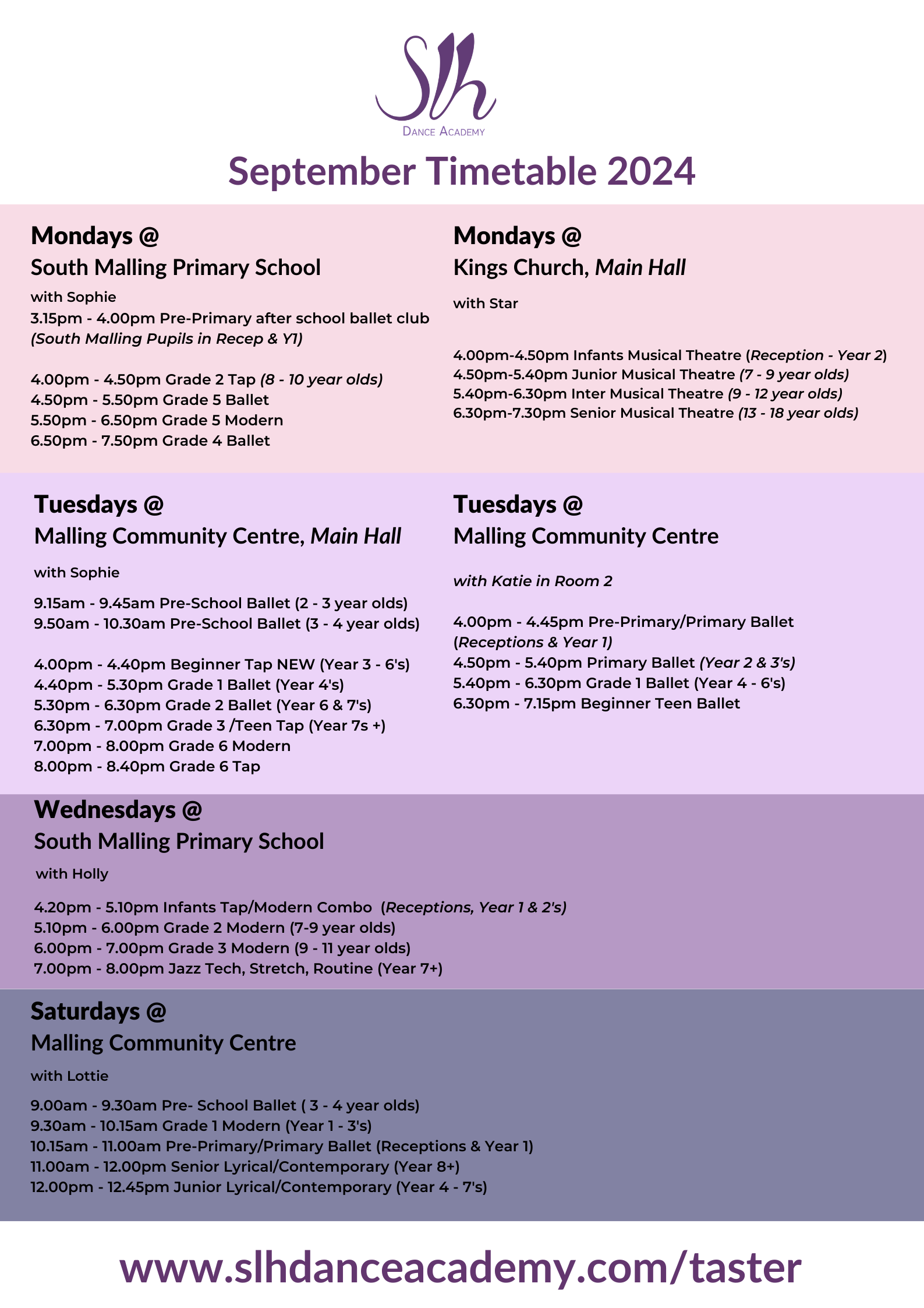Please check your invoices carefully for your child’s class time/day. A reminder of the timetable is here: