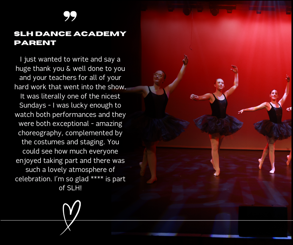“WE HAVE BEEN EXTREMELY IMPRESSED BY SOPHIE’S PROFESSIONALISM AND LOVELY WAY WITH THE CHILDREN.THERE’S A WONDERFUL USE OF IMAGINATION, PROPS AND THEMES EACH WEEK TO MAKE EVERY SESSION DIFFERENT AND EXCITING. OUR DAUGHTER, WHO CAN BE QUITE SHY, HAS LOVED COMING AND LEARNING BALLET FOR THE FIRST TIME. THE OPEN SESSIONS AT THE END OF EACH TERM ARE A LOVELY WAY FOR PARENTS TO FEEL CONNECTED AND SEE ALL THAT THE CHILDREN HAVE BEEN DOING. WE WOULD THOROUGHLY RECOMMEND SLH DANCE ACADEMY.”