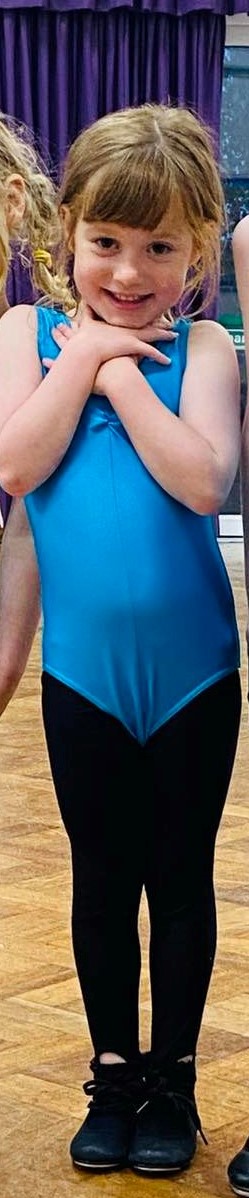 Girls– Kingfisher blue lyrca leotard, black lycra stirrup leggings and bare feet or jazz shoes.